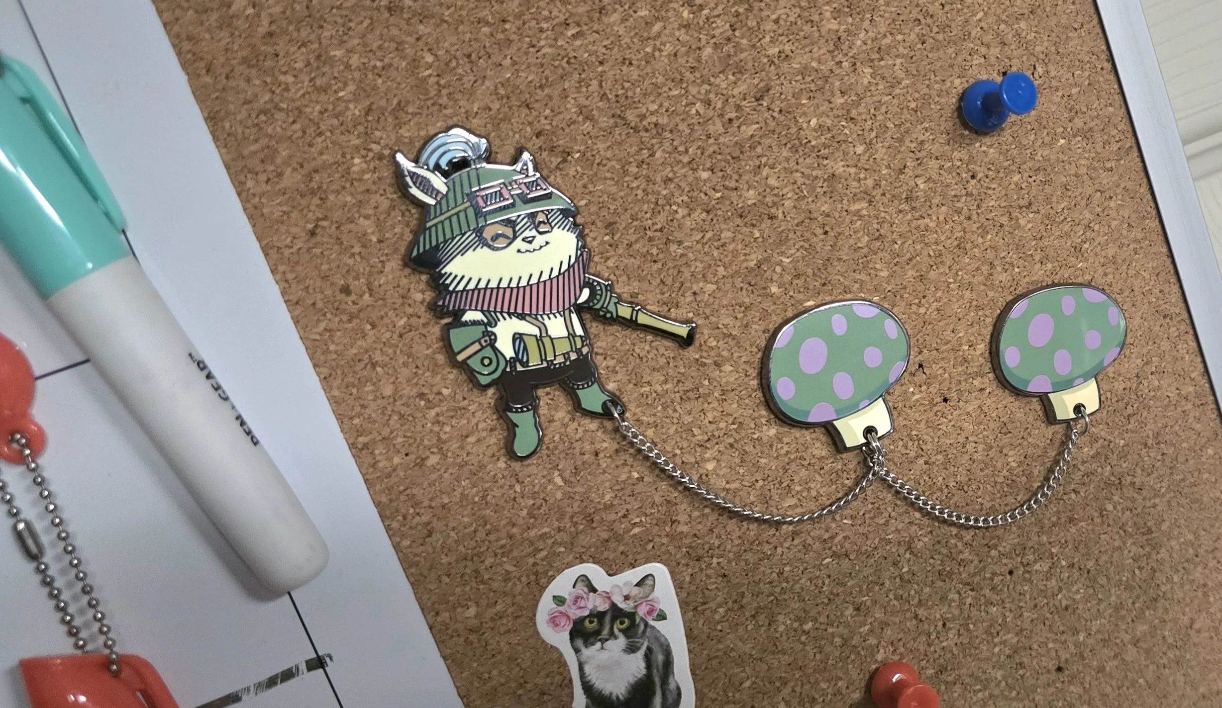 I designed this pin in Adobe Photoshop and translated it into Adobe Illustrator. This pin is hard enamel with chains running between multiple pins.